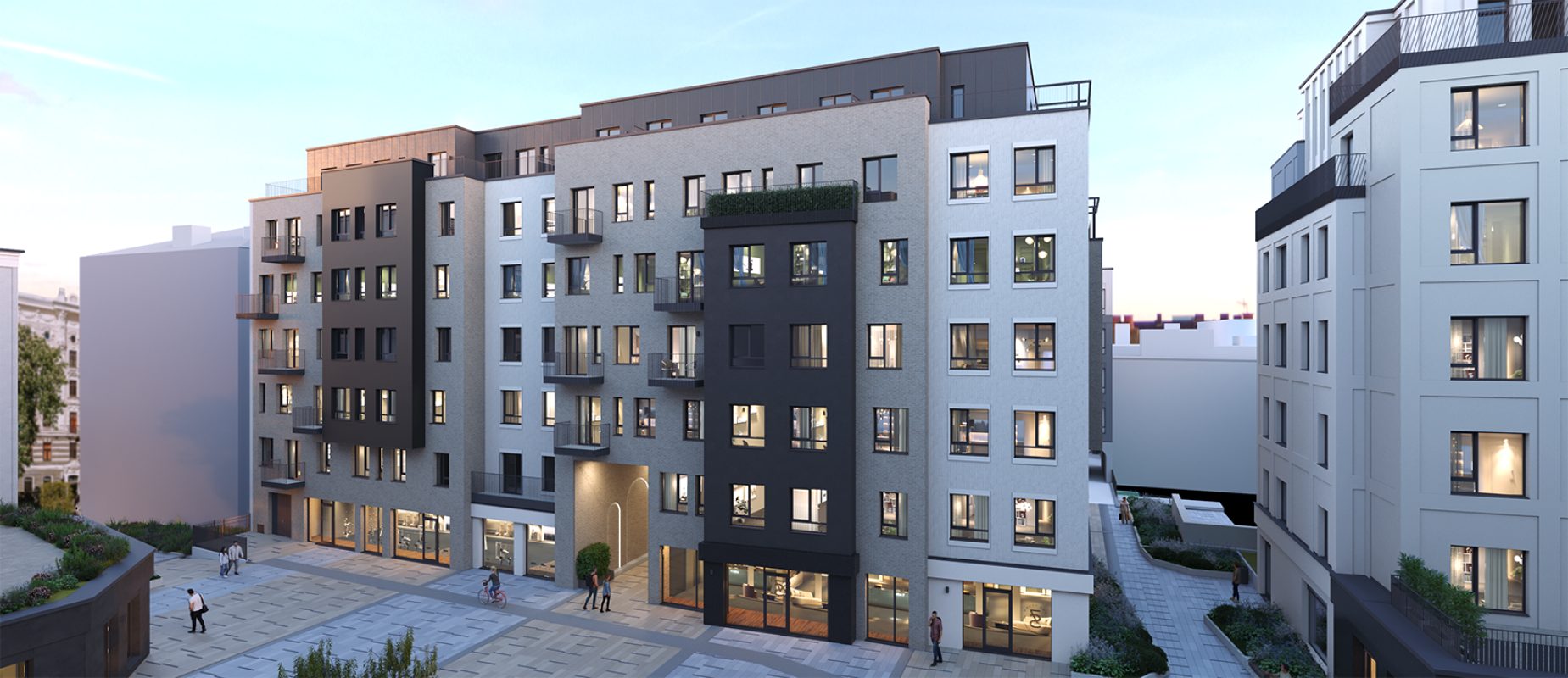 Пять новостроек. Фасадные здания со стороны улиц Блауманя и Дзирнаву идеально подходят для сторонников динамичного образа жизни. Три здания во дворе – для ценителей тишины, с широким выбором планировки квартир.